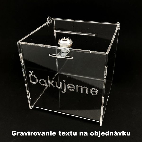 Tento plexi box môže byť použitý na zhromažďovanie peňazí, lístkov, kariet a iných dôležitých informácii. Takisto môže byť použitý na charitatívne účely, ako krabička na zber darov. V hornej časti boxu sa nachádza otvor na vkladanie lístkov s rozmerom 80*6 mm. Plexi box je uzamykateľný, preto si môžete byť istí, že obsah krabičky je bezpečne chránený.
