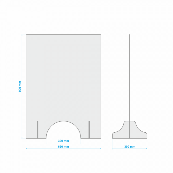 Plexi ochranná prepážka rozmerom 90*65 cm s dvoma nohami pre lepšiu stabilitu na vodorovnej ploche. Prepážka je vyrobená z číreho transparentného plexiskla s hrúbkou 5 mm. Vďaka lesklým hranám je takmer neviditeľná a nenaruší opticky vaše pracovisko.