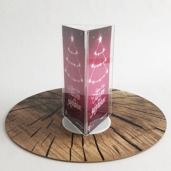 Hlavná výhoda tohto stojanu spočíva v tom že reklamný lístok uvidíte hneď z troch strán. Na spodnej strane stojanu je kruhový podstavec pre lepšiu stabilitu. Stojanček vyrábame vo formátoch pre A5, A6 a DL. Stojan nájde uplatnenie v hoteloch, reštauráciách, bistrách, jedálňach a nielen tam. Stojanček sa najčastejšie používa na stoloch, pultoch alebo na verejných miestach s väčším počtom ľudí ako napríklad výstavy alebo veľtrhy či súťaže. Stojan si môžete zakúpiť s rôznymi farbami podstavca (bielou, červenou alebo čiernou). Každý zákazník si môže nakonfigurovať svoj vlastný stojanček na letáky. Zvoliť si môžete formát stojanu aký sa vám hodí a potom si môžete vybrať farbu podstavca ktorá sa najviac zhoduje s vašimi firemnými farbami.