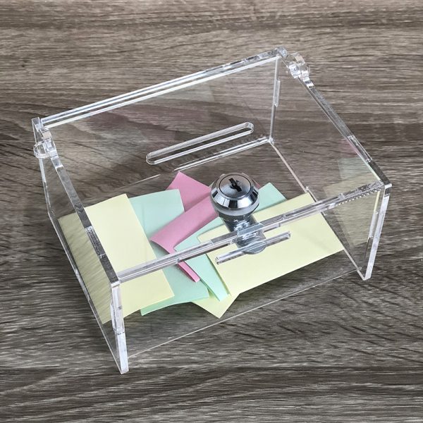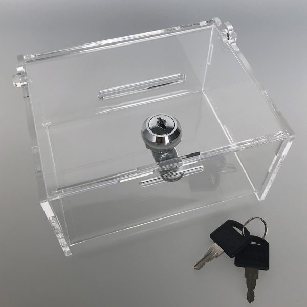 Uzamykateľná pokladnička 15x12x8 cm, hrúbka 4 mm vhodná na mince, bankovky, vizitky, súťažne karty atď. Plexi pokladnička môže sa použivať aj pre zber kontaktných vizitiek. Uzamykateľná pokladnička je vyrobená z číreho akrylatu s hrúbkou 4 mm. Vhodná pre cirkevné,dobročinné a charitatívne akcie. Štandardné vyhotovenie plexi boxu s uzamykateľným vekom na pántoch. Rozmer horného otvoru je 60*6 mm. Zámok je súčasťou balenia. Rozmery uzamykateľnej pokladničky sú 150*120*80 mm (š*h*v).