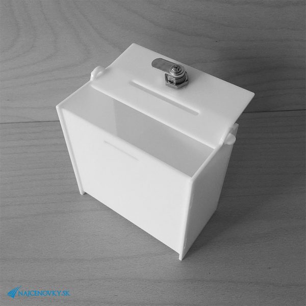 Uzamykateľný plexi box 15x8x15 cm, biely sa používa na zber darov, lístkov, kariet a pod. Takisto sa môže byť použitý na charitatívne účely a umiestnený pri pokladni hypermarketu alebo na recepčnom pulte obchodného centra. Plexi pokladnička je vyrobená z bieleho plexiskla z hrúbkou 3 mm. Plexisklová urna ma rozmer 150*80*150 mm (š*h*v). V hornej časti plexi boxu sa nachádza otvor na vkladanie lístkov rozmerom 80*6 mm. Krabička je uzamykateľná a ma zámok s náhradným kľúčom. Zámok je súčasťou balenia. Plexi pokladnička je pevná a ma lesklé hrany.